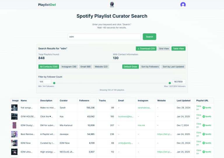 This is what PlaylistOwl automates for you, but in the meantime of round about 60 seconds. Enter a genre or keyword, and within seconds, you get curated results with up-to-date contact info.